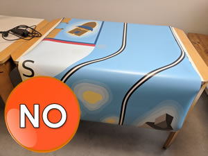 Pour commencer, on pose d’abord les deux éléments à l’extrémité de la table et contenant les aires de départ avant de poser le vinyle du centre.